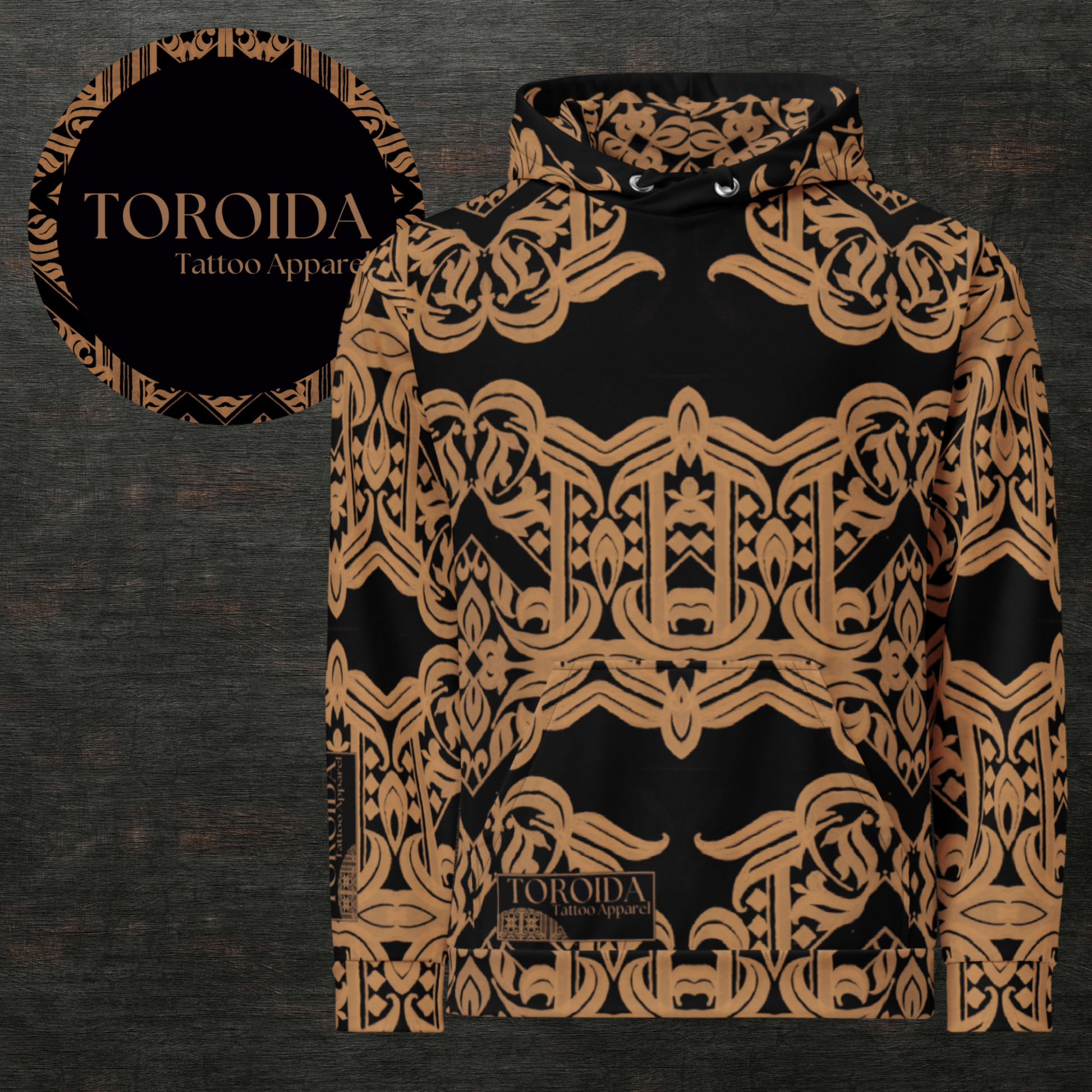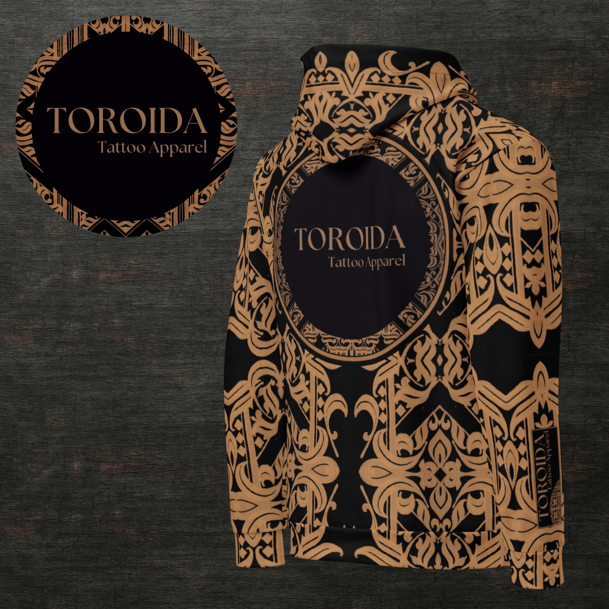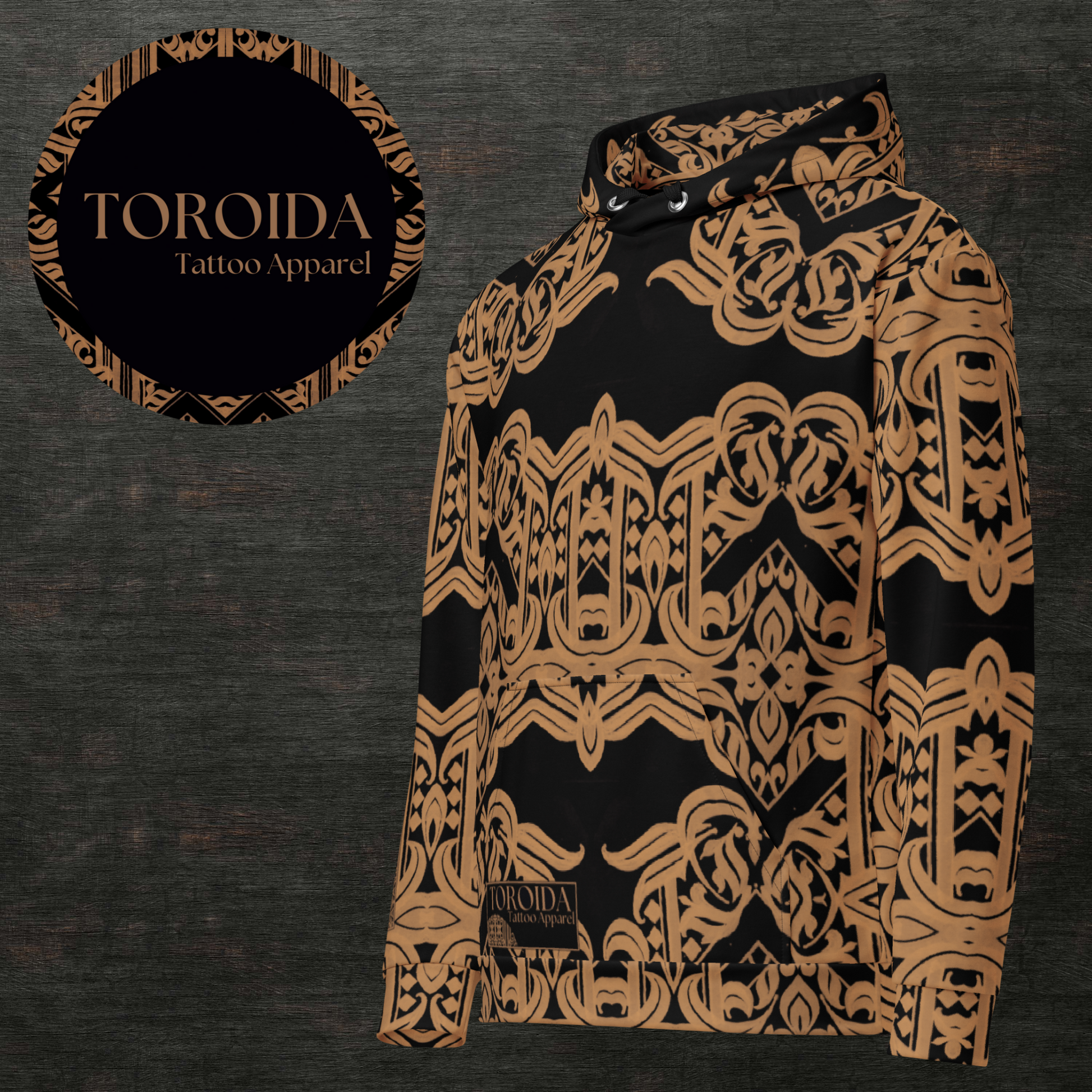 Toroida Tattoo Apparel all over print calligraphic hoodie, featuring unique hand-drawn calligraphy patterns. Wrap yourself in this soft and cozy hoodie, with regal patterns of gold and black. A psychedelic masterpiece of calligraphic flow.